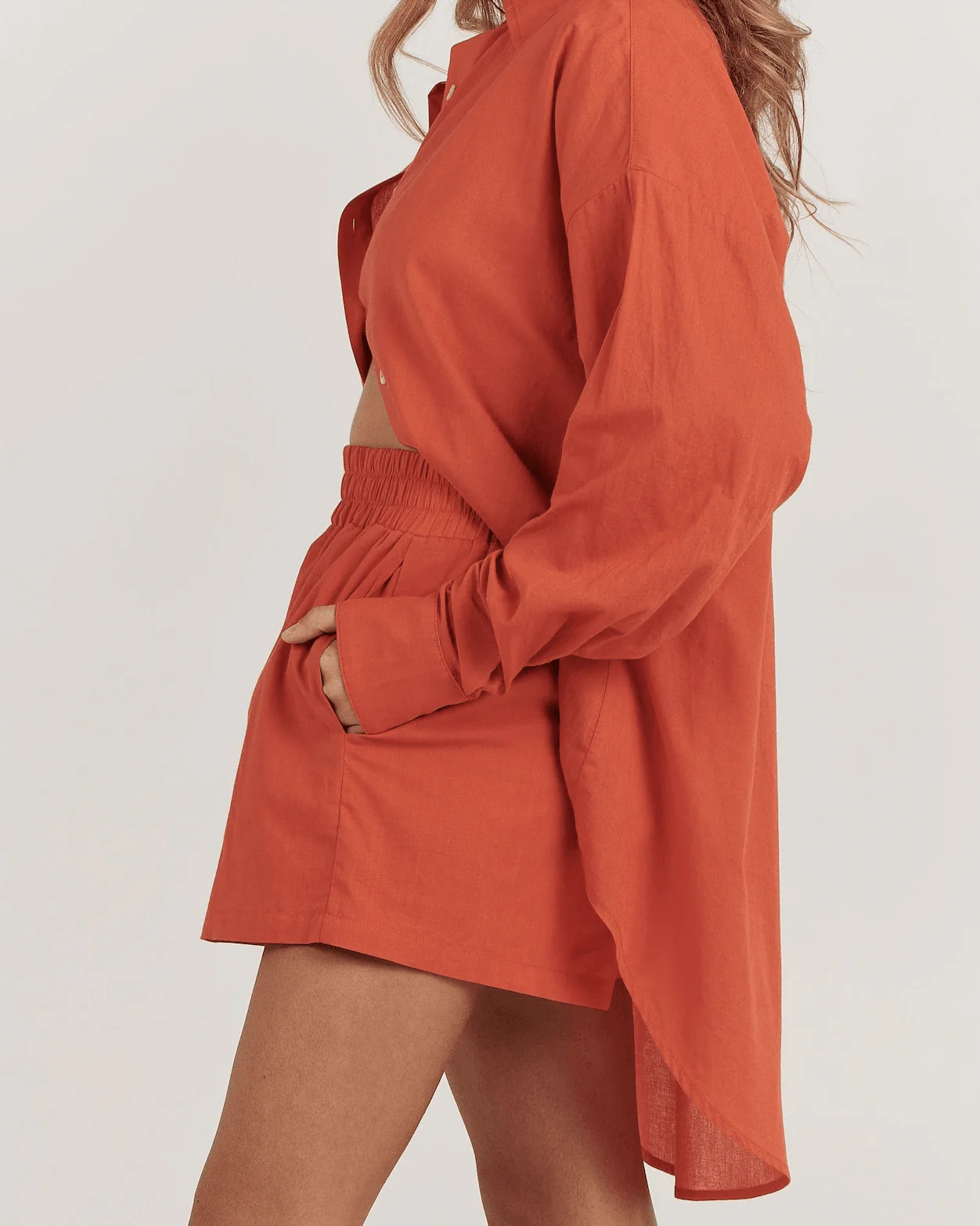 This relaxed lounge short features a high waist and vibrant sunset hue for a fun take on loungewear. Team with the coordinating Maple shirt for a relaxed weekend look.