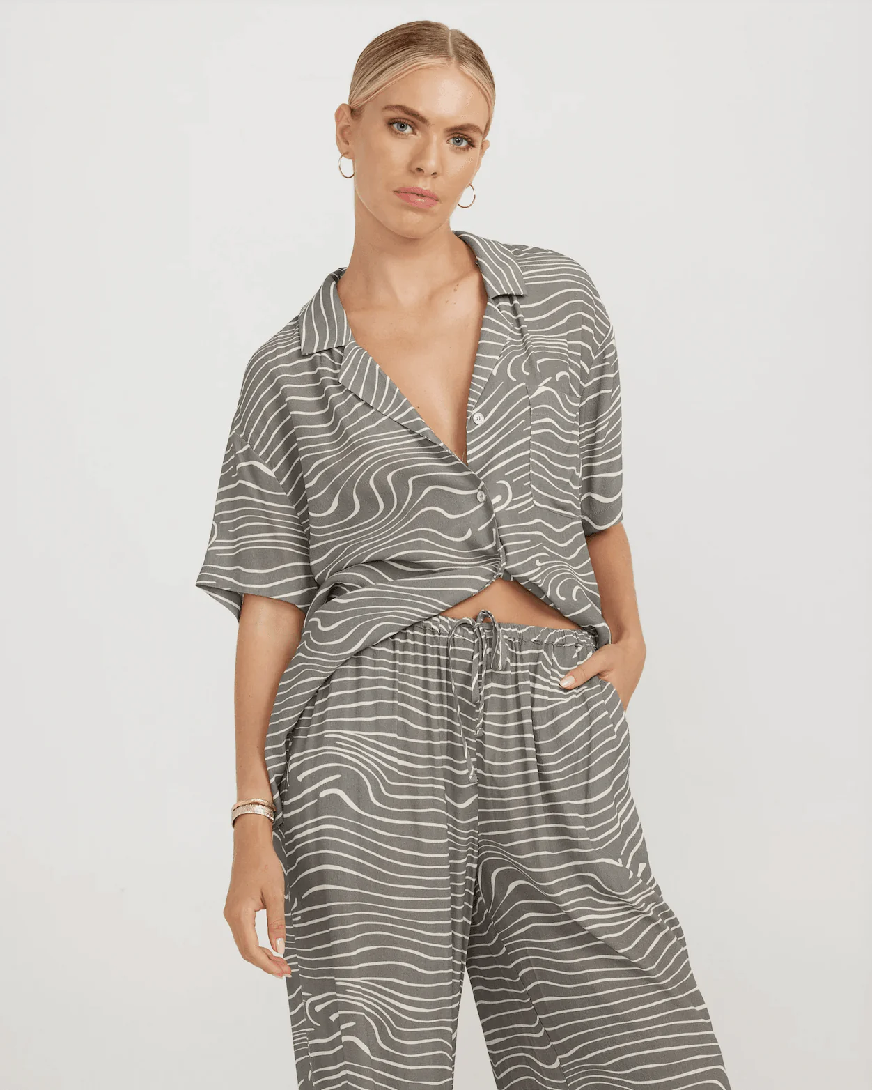 This gorgeous loose-fit cruise shirt features a longline cut and oversized pocket detail. In our new-season hibiscus print it pairs beautifully with the wide-leg Lola pant for an elegant lounge look.